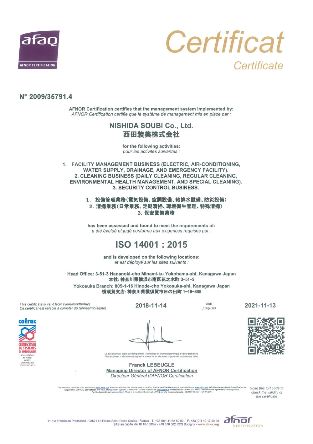 西田装美株式会社はISO9001(品質マネジメントシステム)及びISO14001(環境マネジメントシステム)認証取得企業です